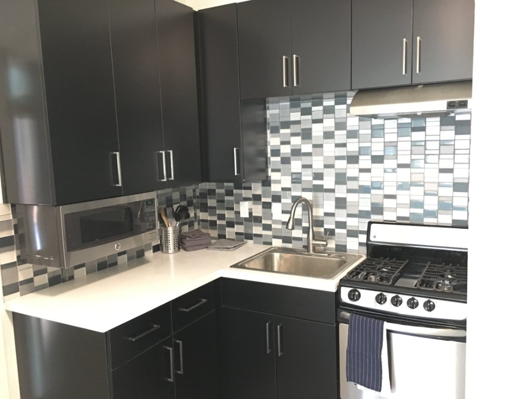 - Modern kitchen with stainless steel appliances and designer cabinets and counters