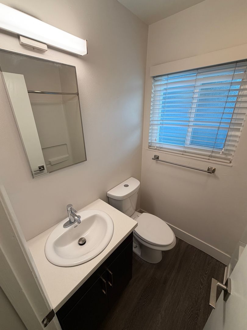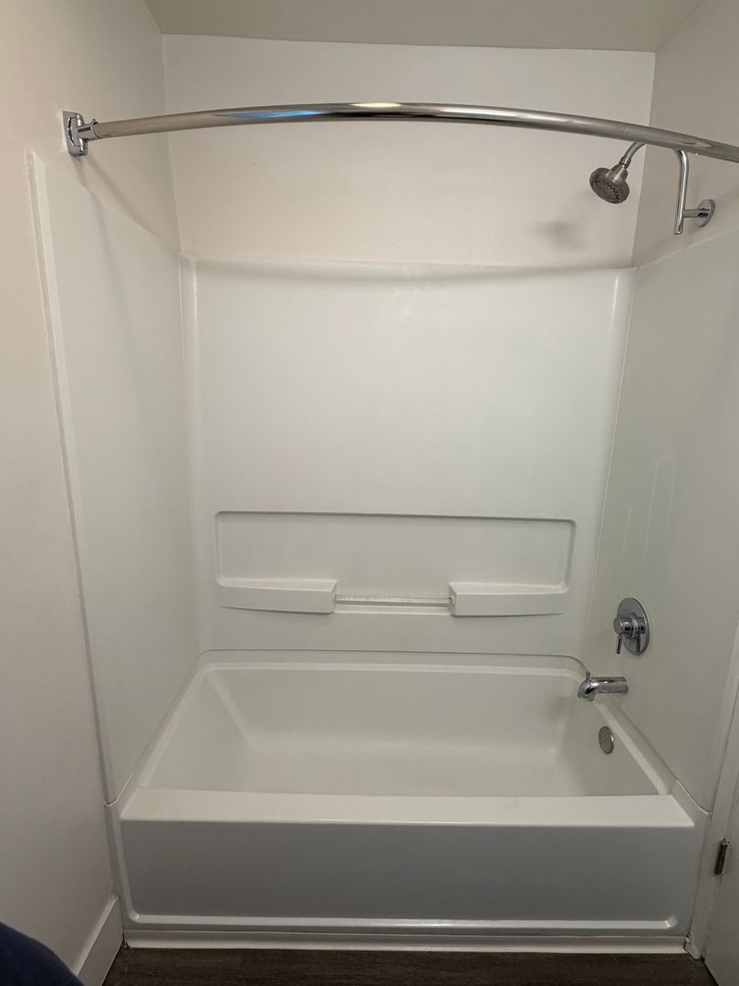 - Fully remodeled bathroom with new vanity, tub, and shower surround.