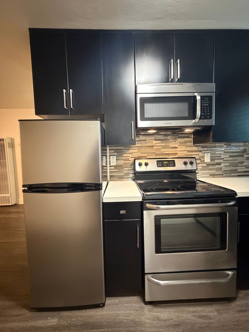 - Modern kitchen with stainless steel appliances and designer cabinets and counters