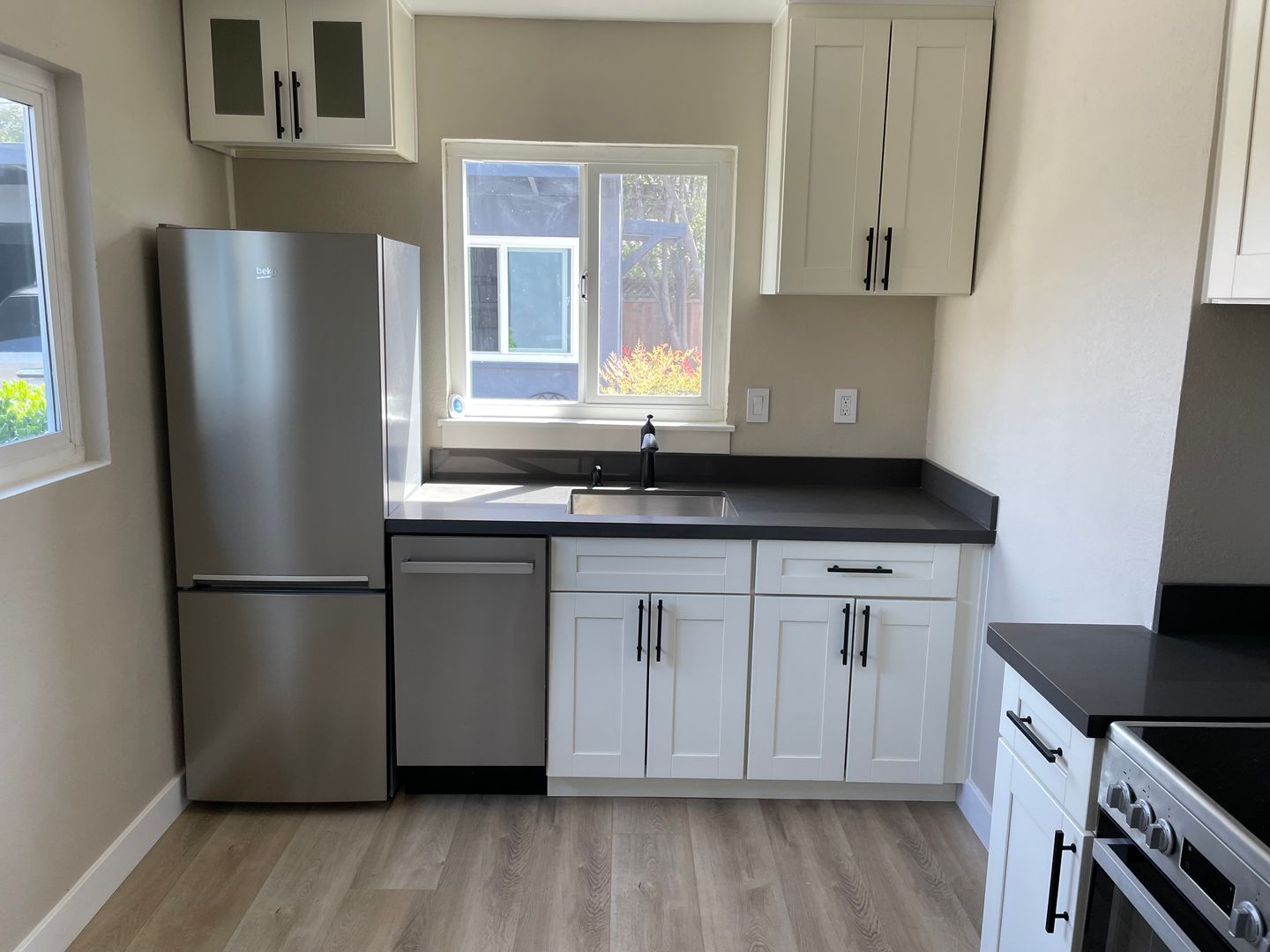 The home features dual-pane windows, fresh interior paint, and a modern kitchen with wood-look luxury vinyl plank flooring, stainless steel appliances, quartz countertops, and an included refrigerator.